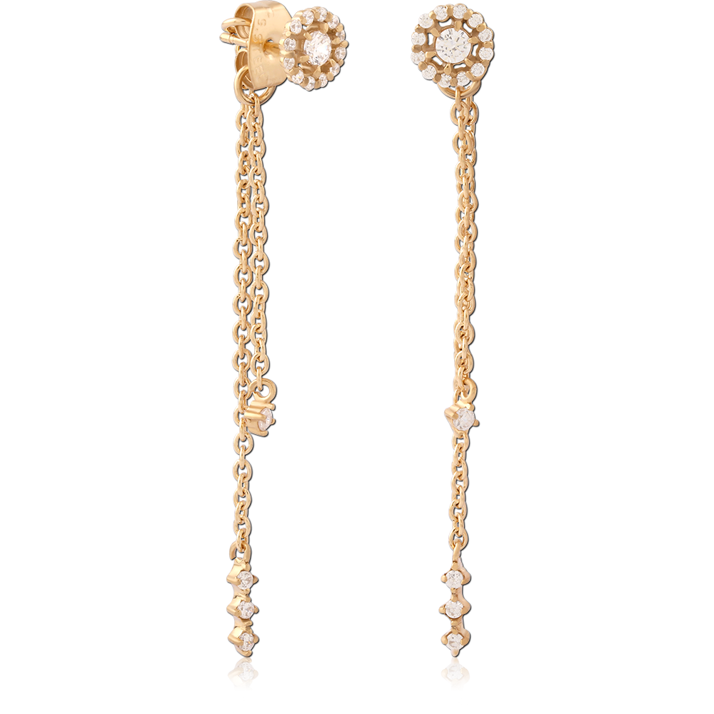 GOLD PVD 18K COATED SURGICAL STEEL JEWELED CHAIN EAR STUDS PAIR