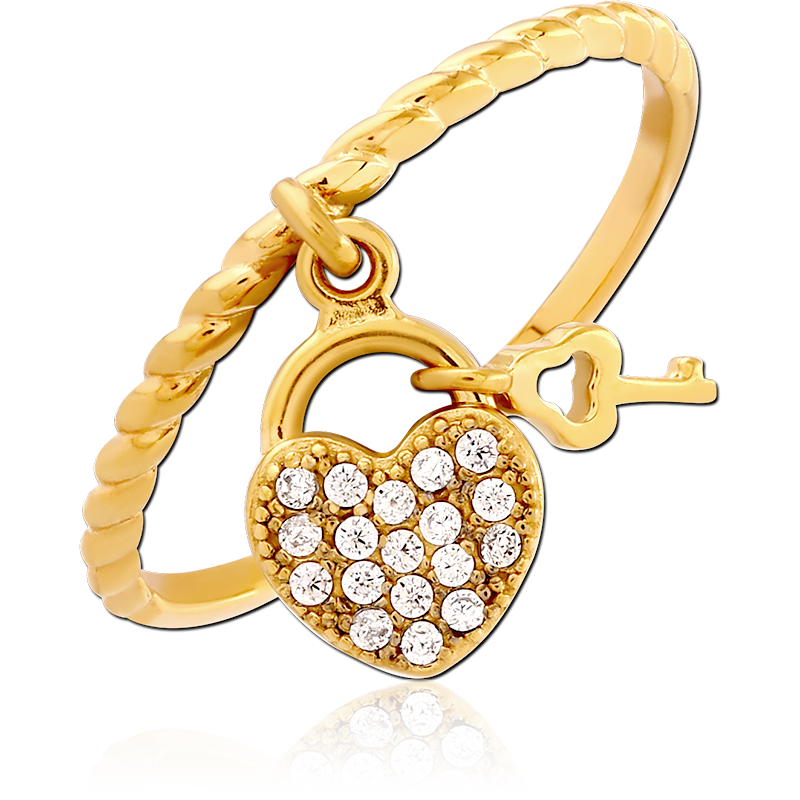 GOLD PVD COATED SURGICAL STEEL RING WITH JEWELED HEART AND KEY CHARM