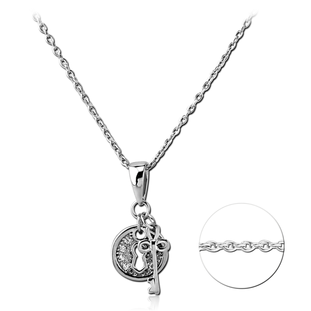 STERLING SILVER 925 RHODIUM PLATED JEWELED NECKLACE WITH PENDANT – ROUND LOCK WITH KEY
